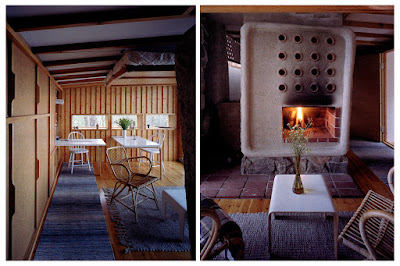 Dividida en cocina y sala de estar por medio de una chimenea-hogar; la pared norte contiene la cocina, los armarios y un tablero de dibujo plegable.